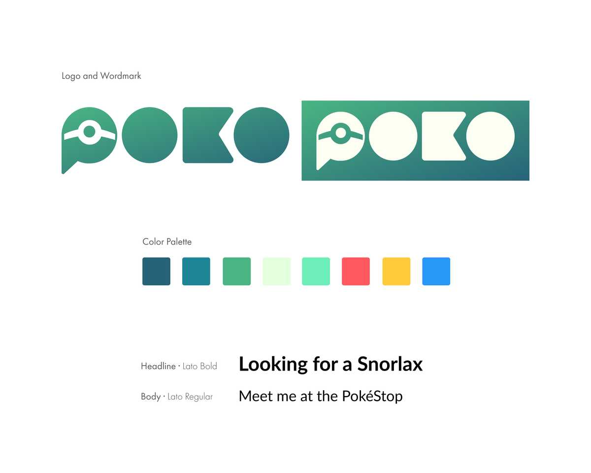 For Poko’s branding, I used a color palette reminiscent of Pokemon Go so that the two apps shared a continuity and users associated the two in their heads. I wanted to keep the branding simple and modern, while also incorporating Pokemon symbolism. I broke the letterforms down to their most basic shapes, allowing the P to utilize negative space and imply the shape of a PokeBall inside a message bubble. I chose Lato for the main typeface because it shared patterns with Pokemon Go’s typeface, while also complimenting our wordmark.
